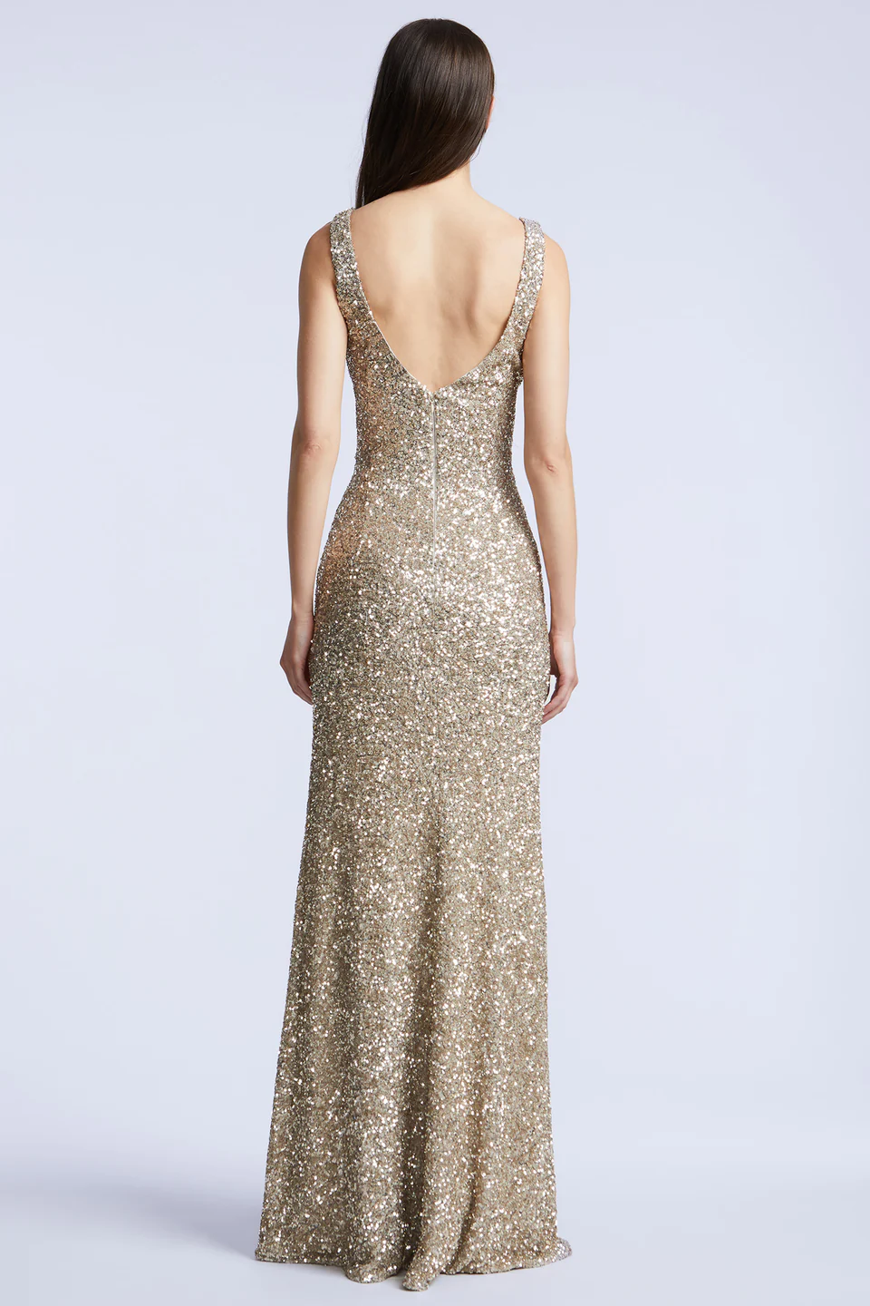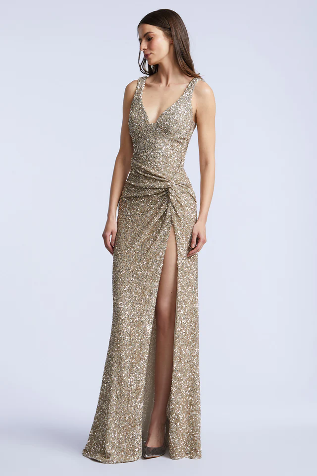 Gold sequin gown with allover sparkle and a sculpted wrap-front waist. Designed with wide straps, a plunging neckline, and a high front slit. A standout piece for galas, weddings, or black-tie celebrations.